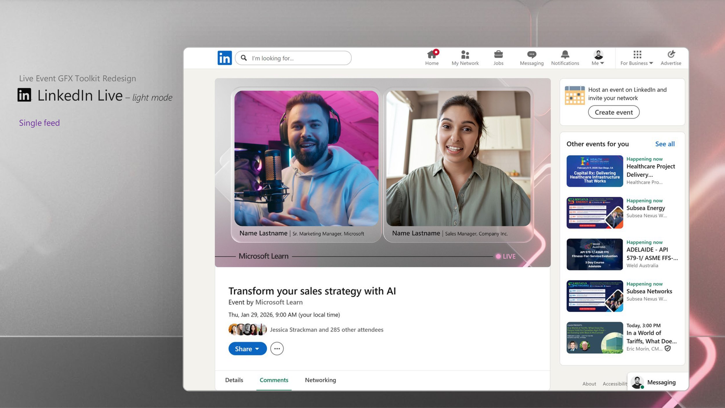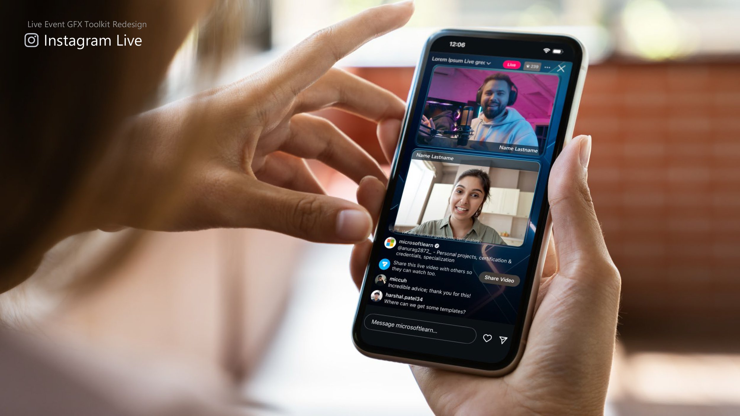 As the Creative Lead for Microsoft Global Skilling’s Social team, I set out to give our live streams a visual upgrade. The challenge was not a reboot but a glow‑up: take familiar design elements and reinvent them with a sharper, more contemporary edge. Built end‑to‑end in Cinema 4D with Redshift and After Effects, the result is a custom graphic toolkit designed to look polished, dynamic, and distinctly modern across our LinkedIn and Instagram channels.